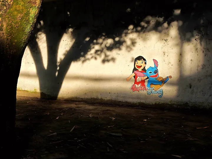 落日余晖透过一棵斑驳的桂花树,落在一座破旧的院墙上,女孩和小精灵欢乐的身影,好像活了