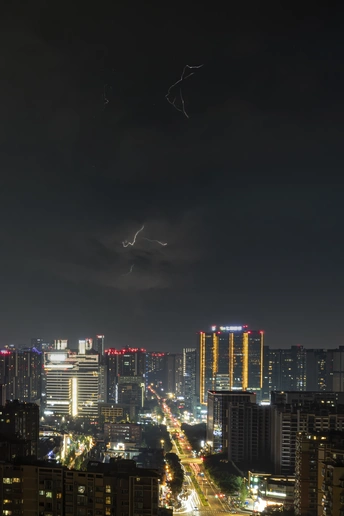 闪电照城:夜幕下的磅礴诗章 这幅城市夜景摄影作品,因闪电的意外闯入而变得震撼非凡,在构图、色彩、情感、主题和艺术价值上都展现出独特魅力。 构图上,画面以城市建筑群为前景,高楼大厦林立,街道纵横交错,延伸向远方。闪电在深邃的夜空中划过,成为视觉的制高点,打破了城市轮廓的规整,增添了画面的动态感与层次感。闪电与城市建筑的上下呼应,构建出一种宏大而紧张的视觉结构。 色彩方面,夜空的深邃黑与城市灯光的暖黄、亮白形成鲜明对比。闪电的银白光芒在黑暗中瞬间绽放,成为画面中最耀眼的色彩,凸显出自然力量的强大与神秘。 情感上,画面传递出一种敬畏与惊叹。闪电的狂暴与城市的静谧相互碰撞,让人既感受到大自然的威严不可抗拒,又体会到城市在自然面前的坚守与从容。 主题上,作品展现了自然现象与人类城市的奇妙邂逅,体现了自然与人类文明的交织与对话,引发对两者关系的深刻思考。 艺术价值上,此作品以独特的瞬间捕捉和强烈的视觉冲击,具有极高的审美价值。它不仅是城市夜景的记录,更是自然与城市融合的艺术呈现,能够唤起观者内心深处的共鸣,激发对自然和城市生活的热爱与敬畏之情,堪称一幅具有深刻内涵的优秀摄影佳作。