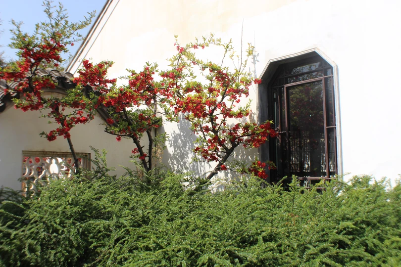 白墙黑瓦与绿叶红花相互映衬,色调素雅明净,如诗如画,美不胜收。