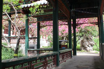 盛开的桃花和古朴的回廊