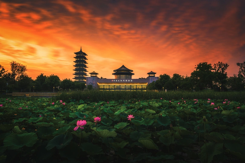 夏日扬州中国大运河博物馆的世纪晚霞!