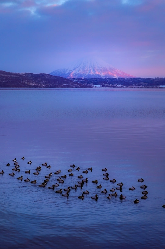 2月2日晨的洞爷湖, 若即若离的粉色晨光 用快门, 将稍瞬即逝的美好永远定格。 不得不说, 日出的羊蹄山太美了。