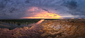 新疆五彩滩在日落时分展现出震撼人心的丹霞地貌奇观。近处,五彩斑斓的岩石层叠交错,红、黄、紫、橙等色彩如火焰般燃烧,岩层纹理如刀刻斧凿,在斜阳下更显立体。
