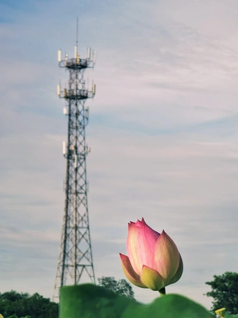 近处的荷花与远处的铁塔相比高低。