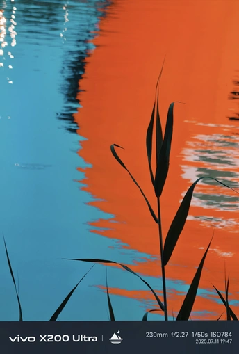 在彩灯映照下的湖边一株草的剪影。不必做什么后期,直拍下来就是一幅天然的抽象画。