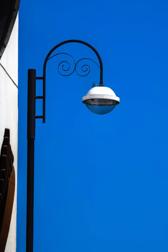 在蓝空下傲然挺立 你是夜的卫士,孤独的哨兵 黑色的枝干如勇士的脊梁 撑起一片宁静的光影 弯弯的臂弯似温柔的臂膀 托举着那洁白的希望之灯 螺旋的花纹是梦的涟漪 在风中轻轻荡漾 每一个夜晚 你都点亮光芒 驱散黑暗的彷徨 为晚归的行人照亮方向 在寂静中默默守望 你是城市的标点 断句了夜的漫长 用坚守谱写无声的诗章 在岁月里静静发光