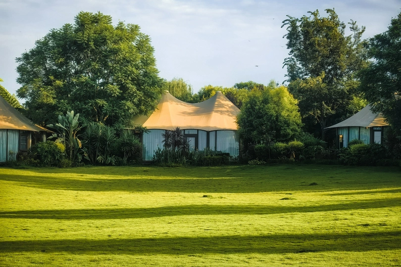 绿野居所:自然与建筑的和谐交响 这幅作品展现了一片宁静的户外居所景象,在构图、色彩、情感、主题和艺术价值上都颇具亮点。 构图上,画面采用了水平布局,前景是一片开阔的绿色草坪,给人以舒展之感。中景处,几座带有弧形顶棚的建筑错落有致地分布在繁茂的植被之间,顶棚的曲线为画面增添了柔和的元素。背景中高大的树木层层叠叠,与建筑和草坪共同构建出丰富的空间层次。 色彩方面,整体以绿色为主调,草坪的鲜绿、植被的深绿相互交织,营造出浓郁的自然氛围。建筑的米黄色顶棚与浅色墙面在绿色的映衬下显得格外温馨,色彩搭配和谐自然,给人以舒适的视觉体验。 情感上,画面传递出一种宁静、惬意的氛围,仿佛是一个远离喧嚣的世外桃源,让人感受到大自然的宁静与美好,内心也随之平静下来。 主题上,作品聚焦于自然与建筑的融合,展现了人类居所与自然环境的和谐共生,表达了对自然生活的向往和追求。 艺术价值上,这幅作品以其和谐的构图、自然的色彩和深刻的主题,具有较高的审美价值。它不仅是对一处景致的记录,更是对理想生活方式的艺术化呈现,能够引发观者对自然与生活的深入思考,是一幅兼具美感与内涵的优秀摄影作品。