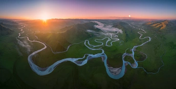7月中旬,黄河源头,日出时分,太阳和月亮在天空交相辉映