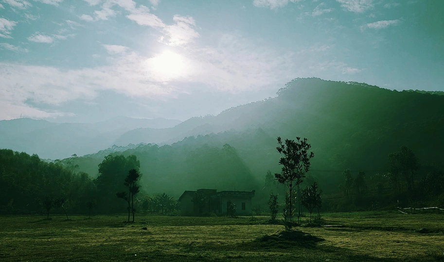晨雾轻笼青山,阳光穿透云层洒落,小屋静卧绿野,树影错落,勾勒出一幅静谧悠远的山间晨景 ,尽显自然的朦胧诗意与宁静祥和。
