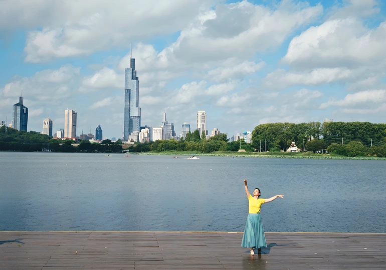 盛夏的阳光下,热爱舞蹈的人在玄武湖边翩翩起舞
