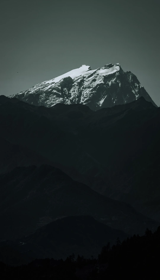 于远观之境,哈巴雪山宛如一幅雄浑壮阔的自然画卷铺展眼前。其山巅皑皑白雪终年不化,在深邃的苍穹之下闪耀着圣洁的光芒,与周边层层叠叠、色调深沉的山脉相互映衬,勾勒出一幅大气磅礴又宁静悠远的景象。山脚下隐约可见的树木轮廓,更为这幅画卷增添了几分灵动与生机。