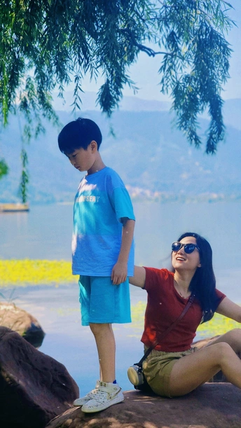 湖畔边,绿树垂枝。小男孩身着蓝装静立石上,身旁红衣女子笑意温柔,伸出的手似传递着亲昵与守护,湖水、远山作衬,满是温馨日常的美好。