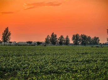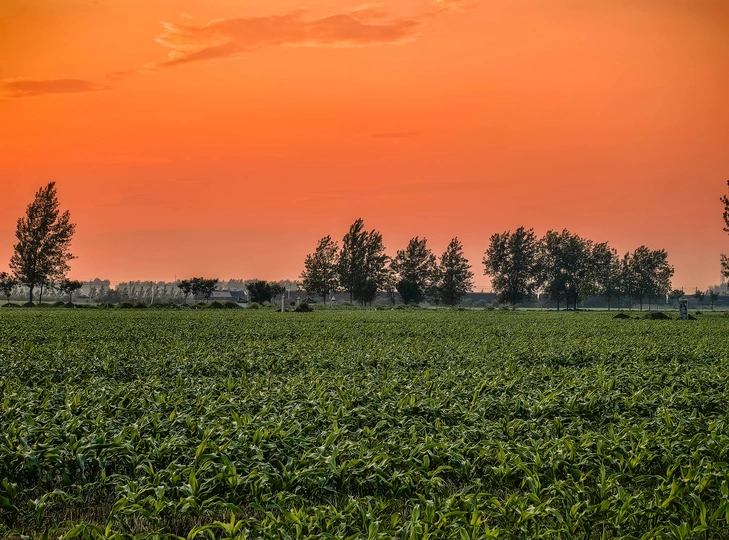 橙红天际倾泻而下,给绿野镀上温柔光晕。树影错落成诗,每片叶都在晚风中轻和,这是田园与黄昏的合唱,把平凡的生长,唱成震撼心灵的自然乐章