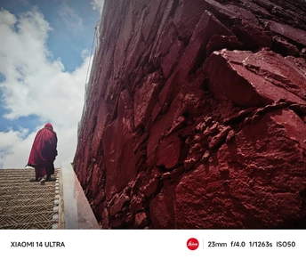 人物篇:红墙为幕,僧人身影或独行、或侧影,袈裟与环境相融,藏地人文的静谧厚重尽显;透过百叶窗的剪影,添神秘朦胧,似在诉说岁月故事。 动物篇:装饰艳丽的白牦牛,与草原、金属架形成奇妙组合;骆驼静卧沙地,蓝鞍具点缀,尽显西北草原与荒漠间的灵动生机。 风景与人融合:青海湖边,红衣人俯身亲水,远山湖水作陪,勾勒出人与自然相依的诗意画面,传递大西北的辽阔与人文温度 。