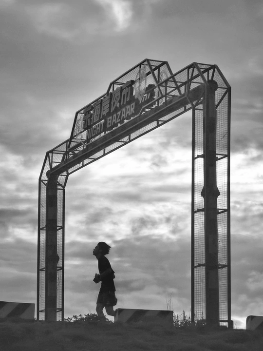一位小男孩在东海岸堤坝观光路上晨跑,抓拍他冲过龙门架那一刻。