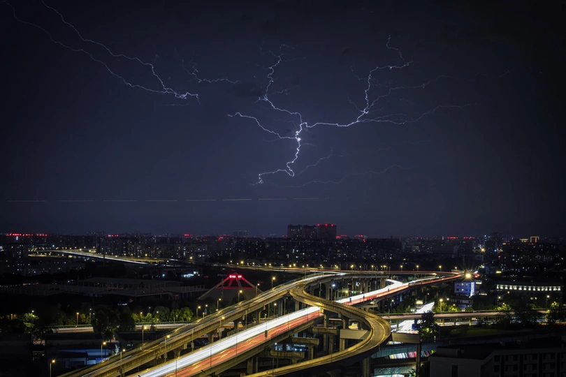 城市闪电风暴摄影作品评价 这幅闪电击穿夜空的摄影作品,以其震撼的视觉效果和独特的构图,给人留下了深刻的印象。 从构图上看,摄影师巧妙地将城市的多层立交桥置于画面下方,形成了一个复杂而有序的几何图案。闪电在画面上方肆意绽放,与下方规整的立交桥形成鲜明对比,动静结合,增强了画面的张力。 色彩方面,深邃的夜空作为背景,衬托出闪电的明亮与刺眼。城市中星星点点的灯光,为画面增添了温暖的色调,冷与暖的碰撞,营造出一种神秘而又充满活力的氛围。 情感上,闪电的狂暴与城市的静谧相互交织,既让人感受到大自然的磅礴力量,又展现出人类文明的坚韧与秩序。这种对比引发了观者对于自然与城市关系的思考。 主题上,作品捕捉到了自然现象与城市景观的瞬间交融,展现了自然与人类文明的共存与碰撞。闪电象征着自然的无常与强大,而城市则代表着人类的智慧与创造力。 从艺术价值来看,这幅作品具有极高的观赏性和收藏价值。它不仅是一张记录自然奇观的照片,更是一件能够引发情感共鸣和哲学思考的艺术品。摄影师通过精湛的技艺和独特的视角,将瞬间的美丽定格为永恒,让观者在欣赏的同时,也能感受到大自然的魅力与人类文明的辉煌。