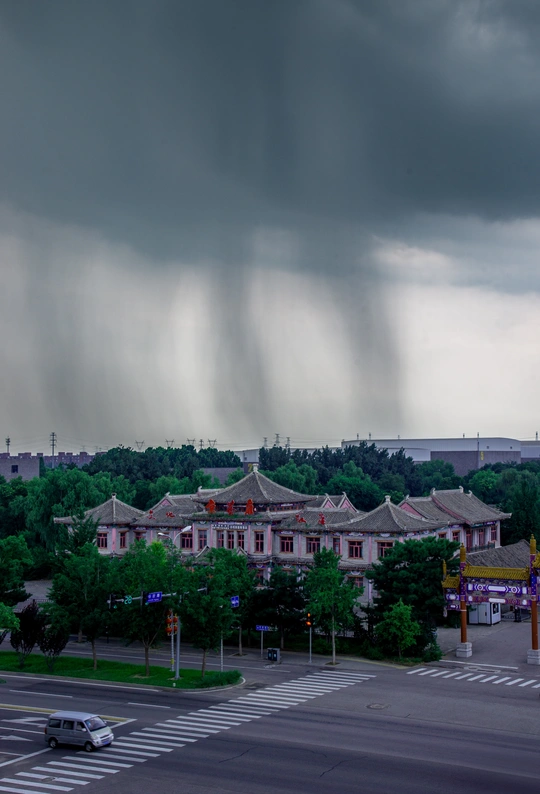 铅灰色的云正从地平线倾轧而来,像一床浸透墨汁的棉被,将整座城市按进潮湿的黄昏。古代官式建筑的飞檐正挑开最后一线天光——朱红立柱还支棱着前朝的风,瓦当却已接住今时的雨。 十字路口机动车碾过的斑马线像道未愈的伤疤,横亘在青砖灰瓦与玻璃幕墙之间。建筑的影子被自己拉得很长,那些雕着缠枝莲的雀替、绘着二十四孝的墀头,在数码时代的像素滤镜里反而愈发清晰——原来时光从不是单向的河流,当钢筋水泥的洪流漫过城池,总有几处榫卯在潮湿的云层下,固执地拼接着文明的断章。 或许所有的对峙终将和解,就像此刻乌云与飞檐保持着微妙的平衡——暴雨尚未倾盆,而沉默的建筑早已在光阴里,学会了用裂缝生长。