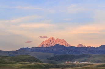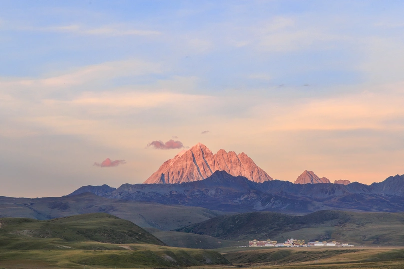 2023年10月拍摄于塔公草原S434路旁,日落时分想象中的日照金山不甚明显,而过后的日照山红却是惊喜