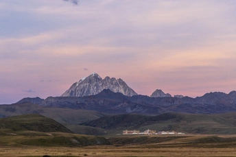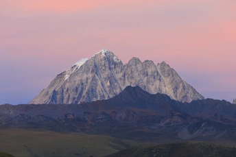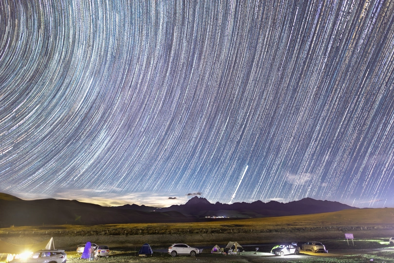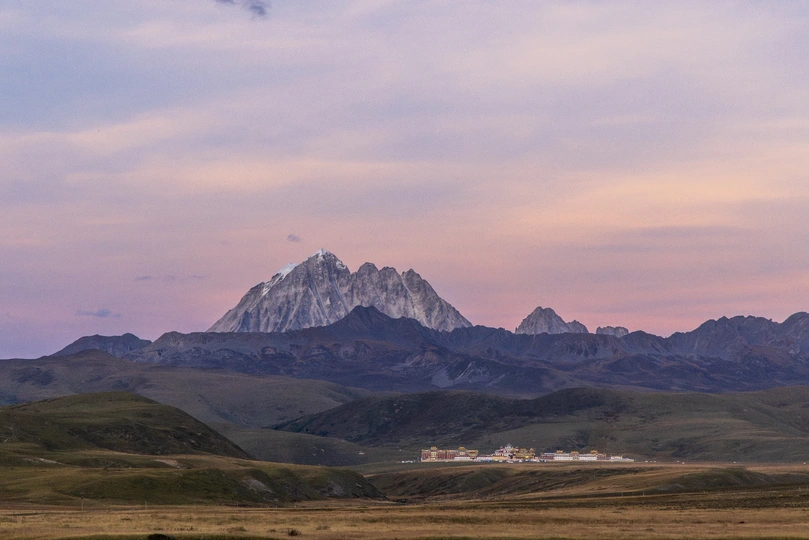 日落将雅拉雪山的天空染成粉色,星点在雪山的夜空划出星轨