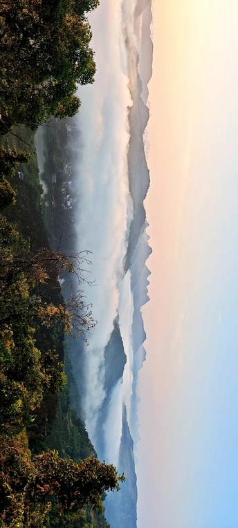 这张照片捕捉了山间云雾缭绕的壮丽景色,整体而言,作品具有一定的艺术价值。在光影方面,晨曦的光线柔和地洒在山峦和云雾上,营造出一种朦胧而富有层次感的光影效果。构图上,画面利用山体的走向和云雾的分布,形成了一定的纵深感。色彩方面,天空的淡粉色与山间的青绿色相互映衬,色彩和谐。主题意义上,作品展现了自然景观的壮美,表达了对大自然的赞美之情。氛围上,云雾的弥漫营造出一种宁静、神秘的氛围,令人心旷神怡。稀缺性上,这种云雾缭绕的山景在特定的时间、地点才能拍摄到,具有一定的稀缺性。总的来说,这张照片在光影、色彩和氛围的营造上表现出色,但构图和主题表达上还有提升空间。