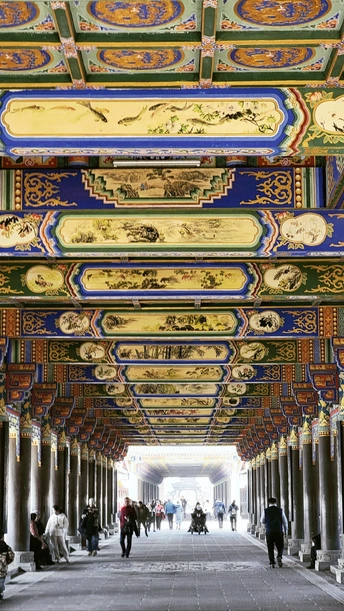 古建长廊内,绚丽彩画布满梁枋,山水鱼鸟等图案绘于其间,色彩斑斓且富有古韵。行人穿梭漫步,新与旧、动与静交融,展现历史建筑的当代活力 。
