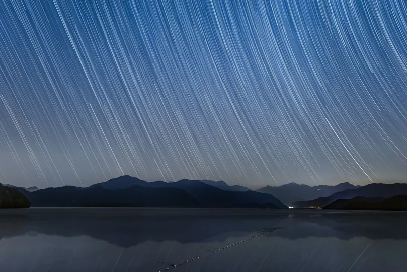 暮色将山峦浸成墨色剪影,星子便提着银线,从穹顶漫溯而下——千万道星轨如时光的脉络,在夜空中悄然铺展。镜湖敛尽涟漪,将整片星河的流动轻轻收纳,连远处的山影都卸去了锋芒,枕着粼粼星辉,同这方天地一道,沉进永恒的静谧里。 每一道光的划痕,都是宇宙写给人间的信笺;而镜湖如鉴,倒映着星河流转的轨迹,也照见心灵深处的清宁。天地俱寂时,星轨是时间的絮语,湖水是自然的留白,山与夜默默相拥,把“永恒”与“瞬间”,都晕染成这片温柔的蓝。