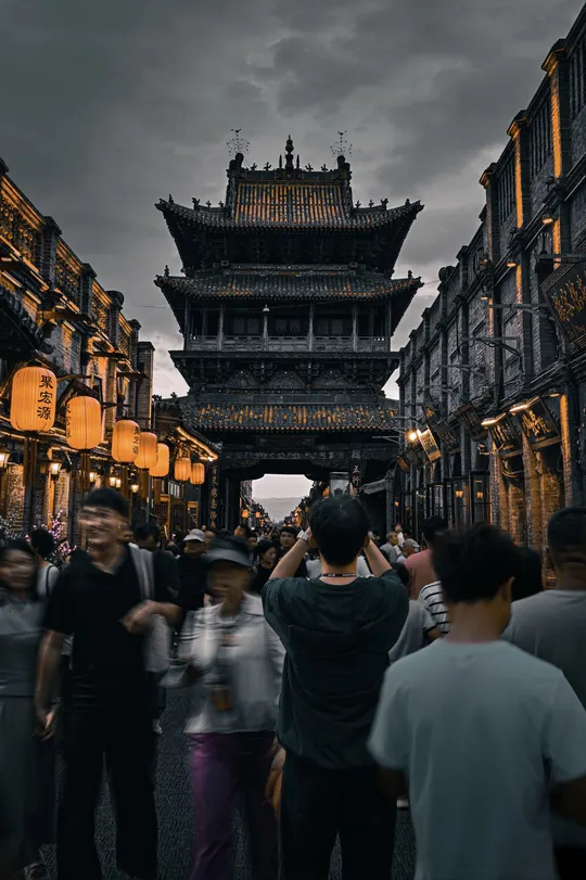 蓝调时刻,古城中的商铺们纷纷开始招揽客人,亮起灯来,远处的木塔与近处的人流相映成趣,其中还有一位拍摄者记录下这美好的瞬间。