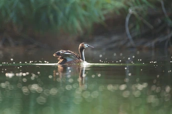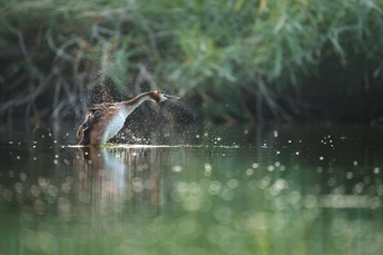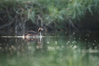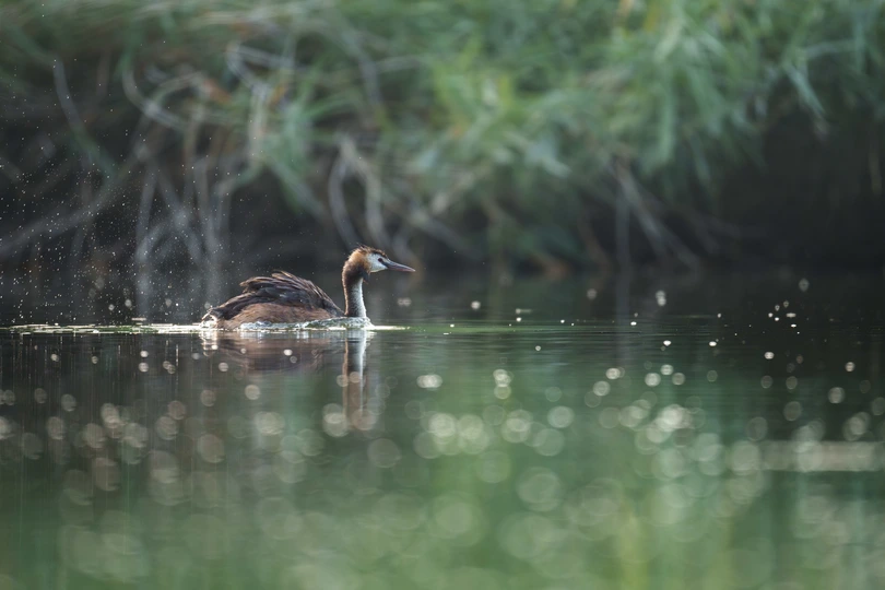 湖面上晨起梳洗羽毛的凤头鸊鷉,下潜把羽毛沾湿又抖落水珠。