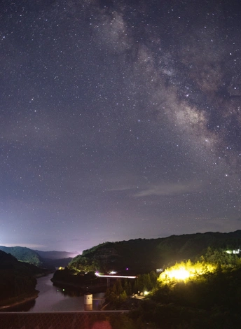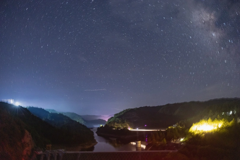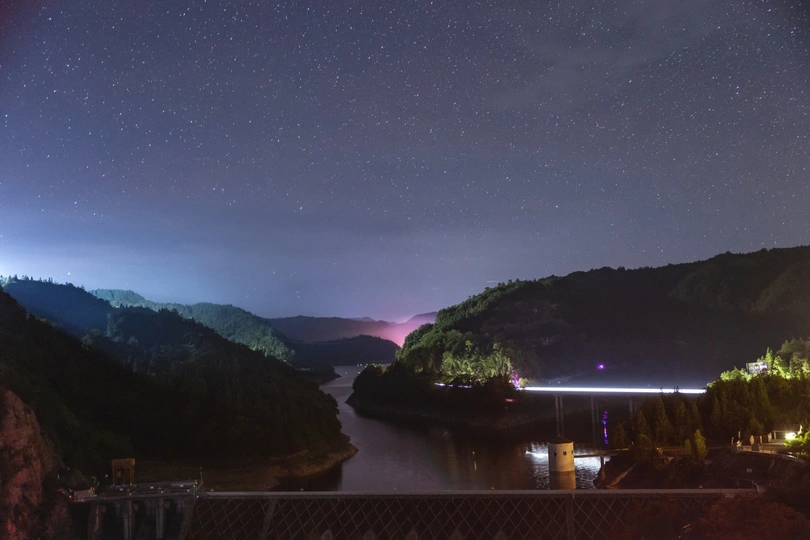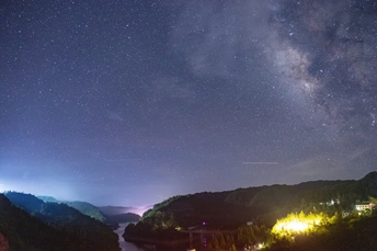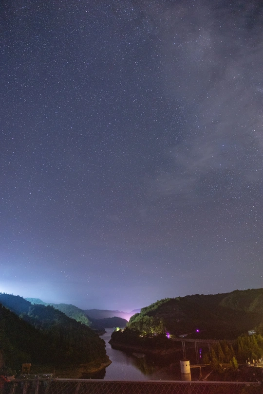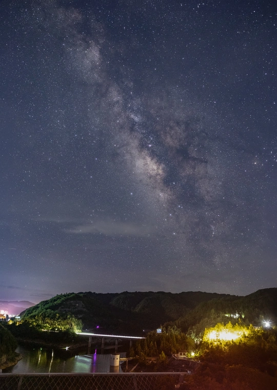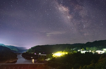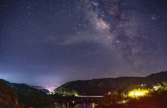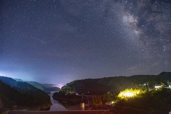 太阳湖畔夜未央,星河如瀑梦飘荡。山影绰绰伴光漾,此夜沉醉宇宙香。