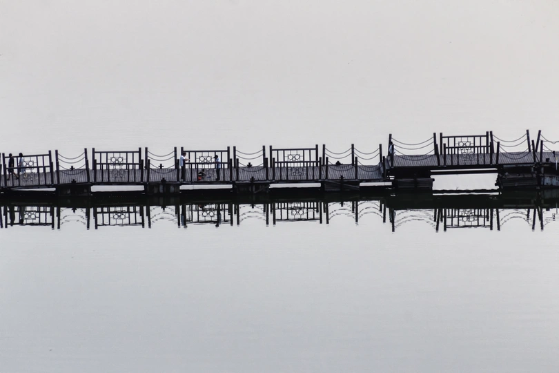 《静谧之桥:水镜上的诗意栖居》 这幅作品以极简的构图和淡雅的色调,营造出一种空灵、静谧的意境,给人以深远的审美体验。 构图上,画面采用对称式布局,黑色的栈桥与栏杆横卧水面,其倒影在如镜的水面上完美复刻,形成一条贯穿画面的视觉中轴线,极具形式美感。栈桥上零星分布的几个人影,打破了画面的绝对对称,增添了灵动之感。 色彩方面,整体以黑白灰为主调,栈桥的深黑与水面的浅灰相互映衬,简洁而富有层次。这种低饱和度的色彩处理,弱化了现实的纷扰,凸显出画面的纯净与安宁。 情感上,作品传递出一种宁静、悠远的氛围。栈桥上的人或驻足、或漫步,仿佛在享受这片刻的静谧,让观者也不由自主地沉浸其中,忘却烦恼。 主题聚焦于自然与人文的和谐共生,栈桥作为人类活动的场所,与平静的水面融为一体,展现出一种人与自然相互依存的美好画面。 从艺术价值来看,这幅作品以简洁的视觉语言传达出深刻的意境,具有极高的艺术感染力。它摒弃了繁杂的细节,用最纯粹的形式展现自然之美和人文之韵,引发观者对宁静生活的向往和对自然的热爱,是一幅兼具艺术性与思想性的佳作。