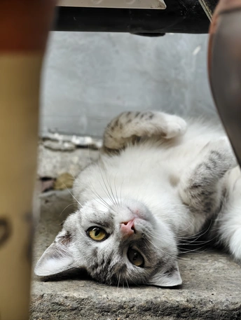 在午后的一隅,邂逅这只小可爱。瞧它自在地躺着,肚皮朝上。那圆溜溜的眼睛,透着灵动与好奇,仿佛在诉说着只有喵星人才懂的小秘密。
