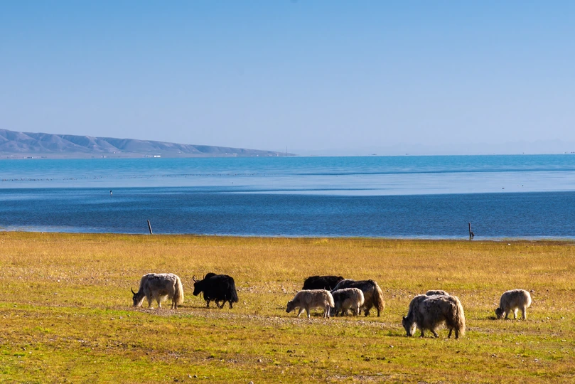 青海湖畔,辽阔的牧场,成群的牛羊,构成一幅优美的草原牧歌