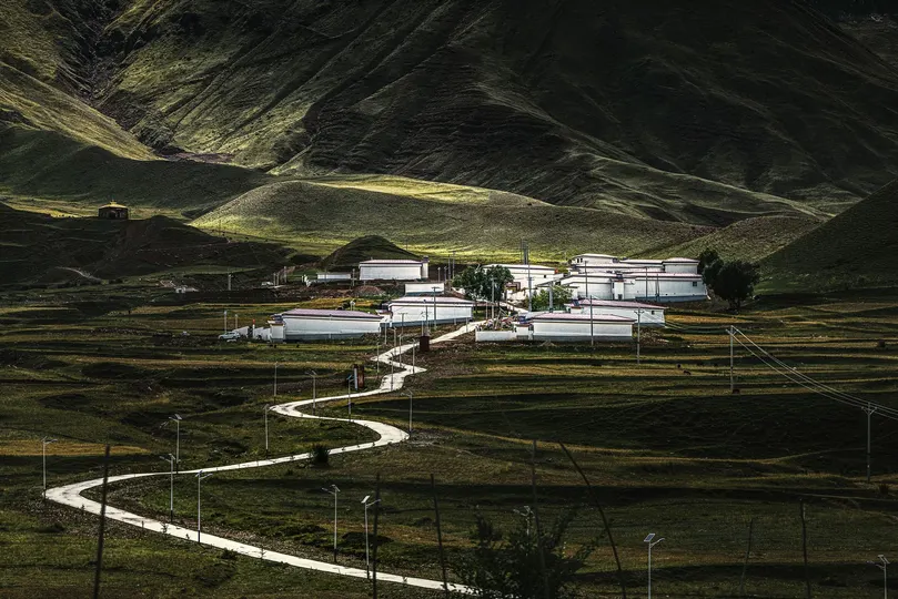 山风掀动草甸的绿浪时,光影正以群山为稿纸、明暗作墨,在藏地的褶皱里写立体诗。白色民居如散落的雪片,以简洁几何形态叩响荒野的门——它们是人类与自然「温柔对抗」的注脚,渺小却醒目地提亮整片绿野,像大地怀抱中不肯褪色的信仰碎片。 蜿蜒小路是人间脐带,一头系着炊烟袅袅的烟火,一头牵向远山金顶的神性。当阳光为山峦雕刻明暗肌理,时间在此刻停滞又流动:阴影里沉着岁月的静谧,草甸金芒里藏着世代走过的脚印,连风都在轻声念诵——这是藏地村落与天地和解的证词,把生存的坚韧、信仰的纯粹,揉进每一道光影与褶皱里,熬成一锅「辽阔却温热」的静美浓汤。