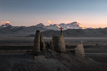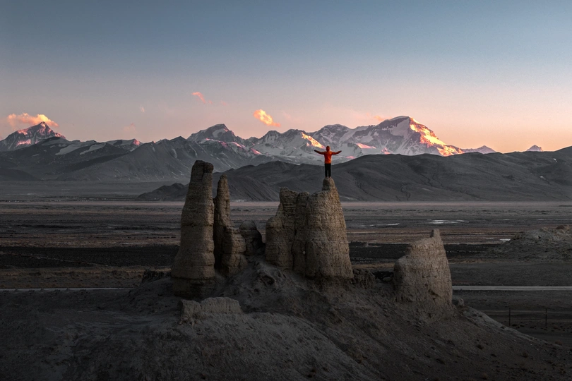 日落时分 在贡嘎古堡遥望远方的喜马拉雅山脉