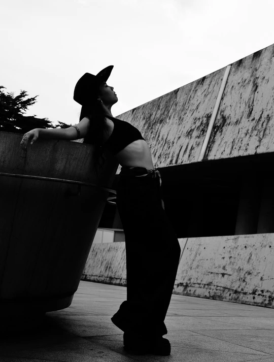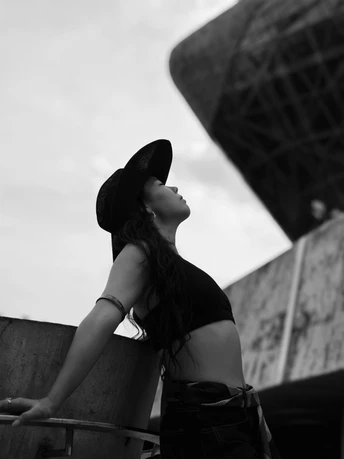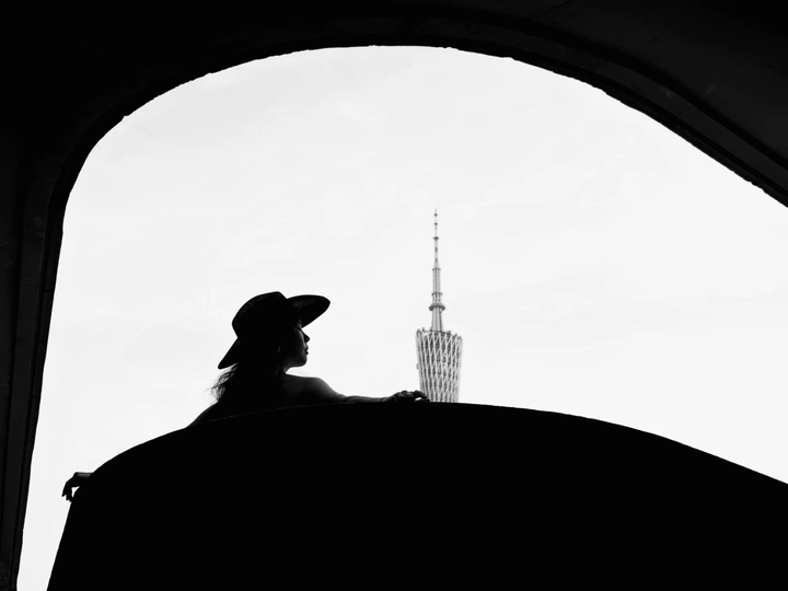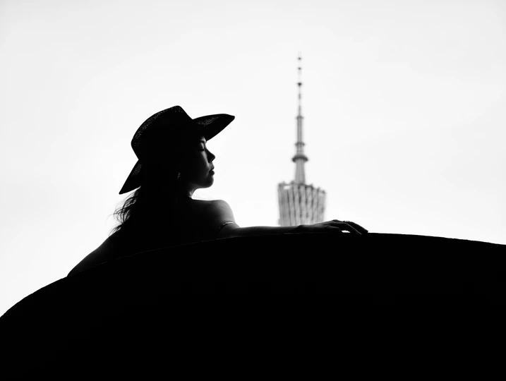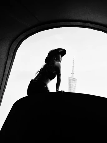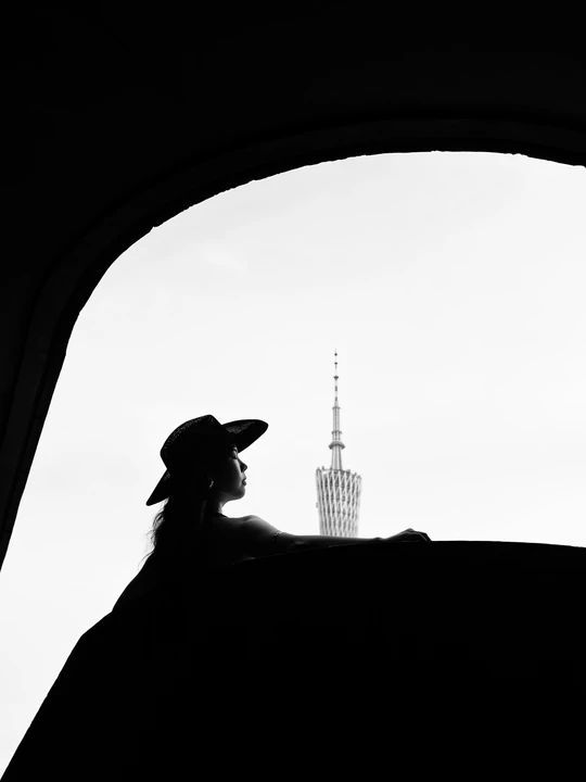 黑与白的剪影里, 她与建筑、小蛮腰对峙。 帽檐压不住目光, 在天地间,把自由的姿态拉长, 任思绪缠上小蛮腰的轮廓,悄然生长 。