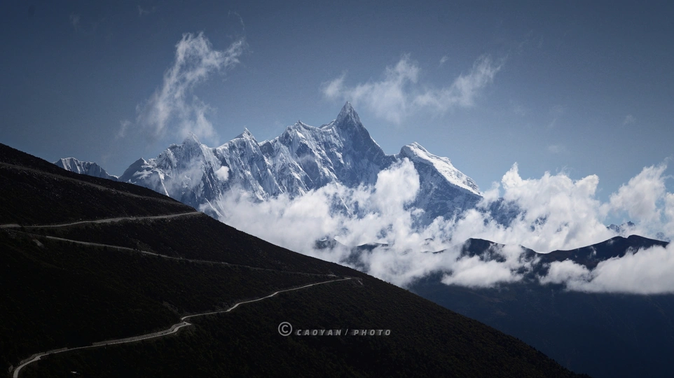 在天地的穹顶下,南迦巴瓦峰如沉默的巨人,傲立云巅。冰川是它不朽的铠甲,云雾似灵动的丝带缠绕。那刺破青天的棱线,是大地写给苍穹的信笺,每一道雪的褶皱里,都藏着亿万年的磅礴史诗,任风云来去,它自以巍峨,镌刻永恒的壮美 。。。