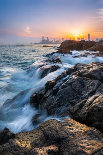 海浪以慢门定格的丝绢质感,轻柔漫过嶙峋礁岩;远方落日将天际熔铸成暖金画布,城市建筑群在暮色中勾勒出朦胧剪影。自然的磅礴韵律与都市的静谧轮廓交融碰撞,每一道浪痕都晕染着黄昏的温柔,每一缕余晖都诉说着海岸的浪漫,绘就一幅 “天地共色,城海和鸣” 的诗意图景。