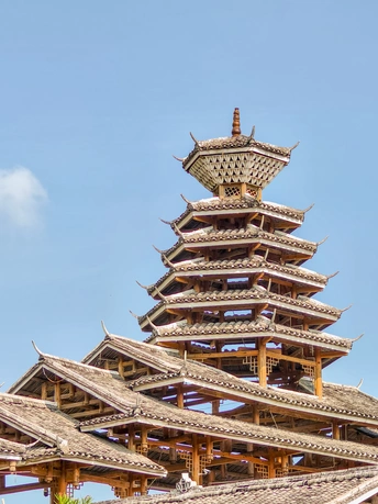 镜头对焦时,十二道飞檐正在切割蓝宝石般的天空。榫卯咬合处的木纹里,藏着光绪年间老匠人未干的墨斗线——那些用蕨类汁液调制的靛青,在百年风雨中褪成烟霞色,却让每道卷草纹都成了会呼吸的活物。我支起三脚架的瞬间,檐角铜铃忽然轻响,不是风动的刻意,倒像是时光抖落的碎金。 宝顶下的藻井在正午投下光的密语。六根朱漆金柱撑起的不仅是三层重檐,更是七十二户人家曾贡献的银饰碎光——老寨民说,光绪二十七年那场大雨冲毁飞檐时,全寨人将传家银簪熔成避雷针,匠人领班刻"风调雨顺"的苗刀,至今仍在梁间留着星火般的缺口。这些藏在木纹深处的掌故,比任何高清镜头都更清晰,它们是建筑的指纹,是触摸时光的盲文。 最动人的留白在取景框之外。当长焦收尽飞檐的弧度,总能看见穿堂风穿过穿枋时,将某扇雕花窗的影子吹得摇晃——那是百年前歌师教姑娘唱大歌的地方,声腔震落过梁上的燕泥,如今却托住了无人机螺旋桨搅碎的云絮。新旧时光在此处达成奇妙的和解:新刷的朱漆沿着老卯眼生长,少年的运动鞋踏过青石板,惊起的麻雀与檐角铜铃共享同一串颤音。