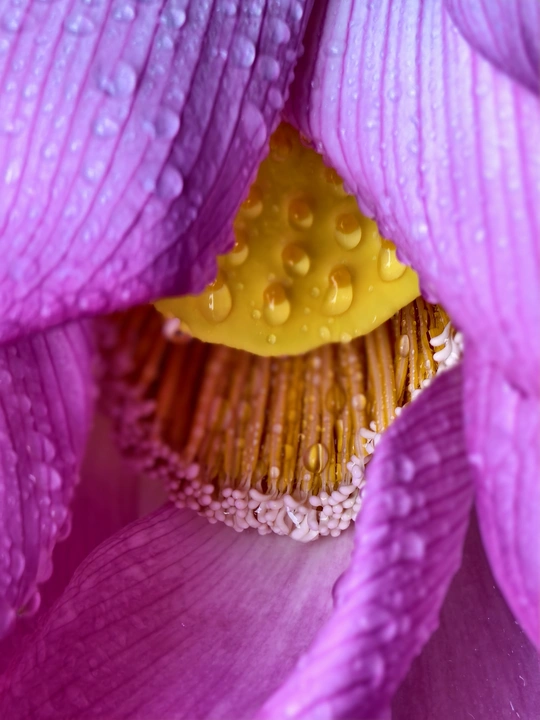 这张荷花特写照片捕捉到了花朵内部的精美细节。粉色的花瓣上布满了晶莹的水珠,增加了画面的生动感。构图上,摄影师巧妙地引导观者的视线深入花心,展现了花蕊的结构和色彩。光线柔和,营造出一种宁静祥和的氛围。色彩搭配鲜明,粉色与黄色形成对比,使主体更加突出。这幅作品在微观层面上展现了自然之美,具有一定的艺术价值。摄影师的对焦准确,细节锐利,值得称赞。