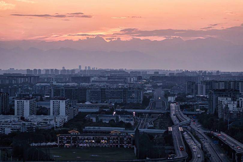 蓉城暮色:自然与人文的交响诗 这幅城市暮色图,宛如一首无声的诗,在构图、色彩、情感、主题与艺术价值上皆展现出独特魅力。 构图上,画面层次分明。前景是错落有致的城市建筑与蜿蜒交错的公路,车辆如流动的音符穿梭其间;中景是连绵的城市轮廓,在暮色中显得静谧而深沉;远景则是巍峨的山脉,在夕阳余晖中若隐若现,与城市形成鲜明对比,拓展了画面的空间感。 色彩运用堪称精妙。天空被夕阳染成了柔和的橙粉色,与城市的冷色调建筑形成冷暖碰撞,营造出温馨又略带神秘的氛围。公路上的车灯如串串红色光点,为画面增添了灵动与活力。 情感上,这幅图传递出一种宁静与悠远。暮色中的城市仿佛褪去了白日的喧嚣,沉浸在一片祥和之中,让人感受到一种内心的平静与安宁。 主题方面,它展现了自然与城市的和谐共生。远处的山脉与近处的城市相互映衬,体现了人类文明与自然景观的完美融合。 从艺术价值来看,这幅作品具有极高的审美价值。摄影师以独特的视角和精湛的技艺,捕捉到了城市暮色的绝美瞬间,不仅是对现实场景的记录,更是对自然之美与人文之韵的艺术化表达,能够引发观者对城市生活与自然关系的深入思考。