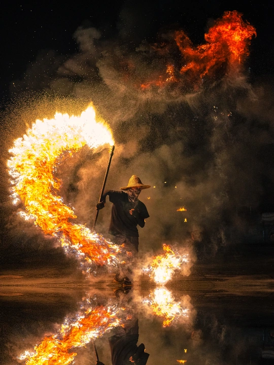 深夜里,艺人挥壶撒焰,火舌划破黑暗,火星如星雨坠落,非遗火壶用炽热写尽传承的狂放。