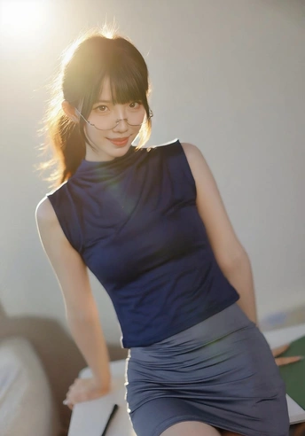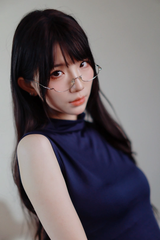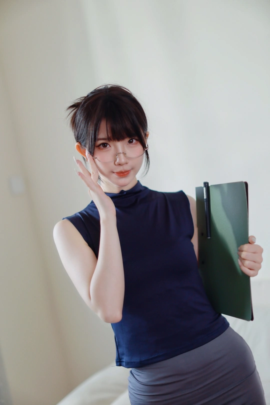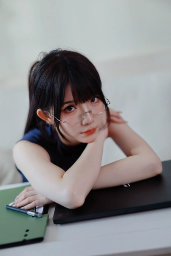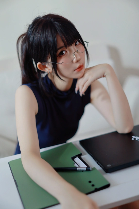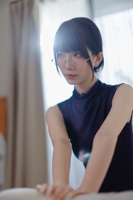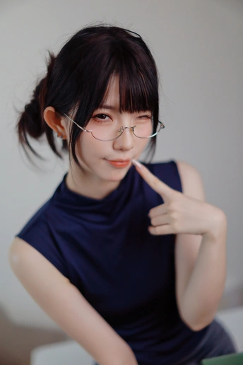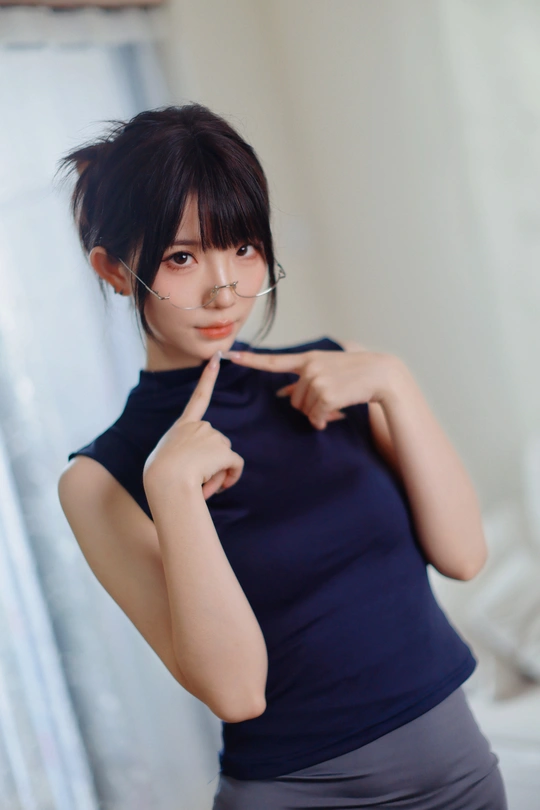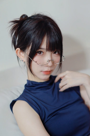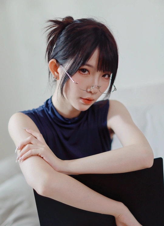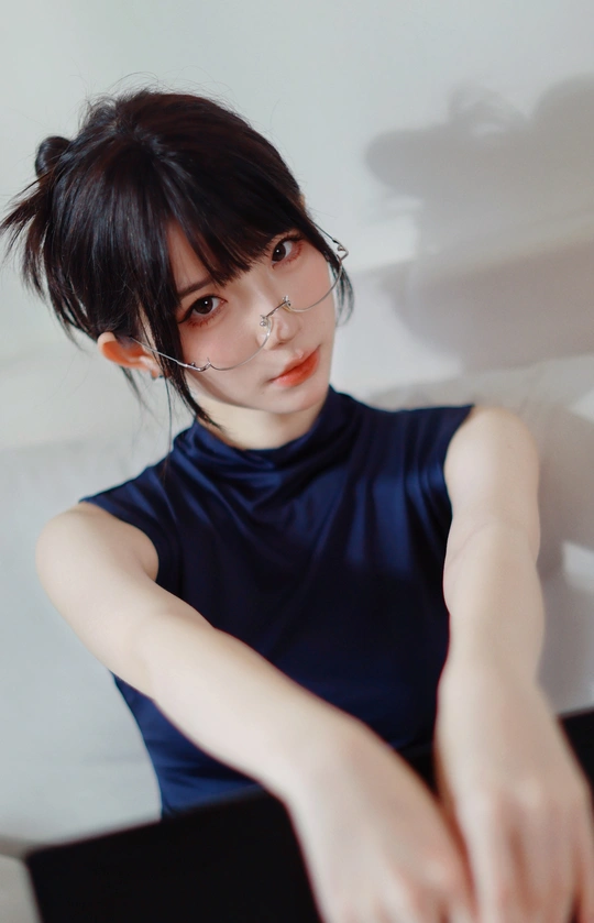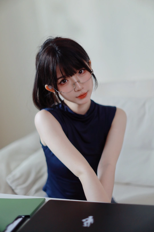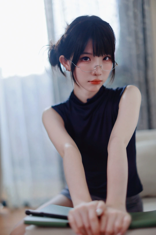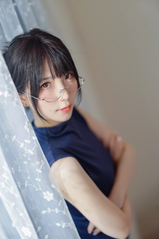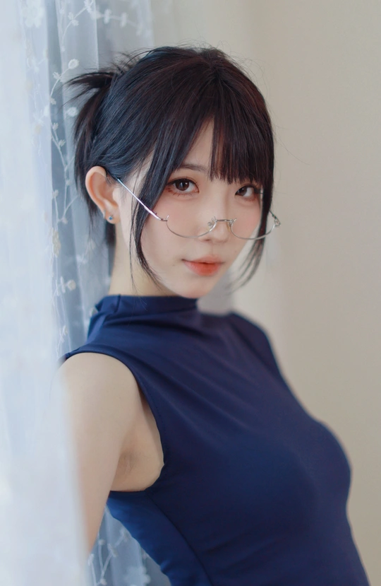 她眉眼间透着沉静,一副精致的眼镜架在鼻梁上,为她增添了几分知性韵味。乌黑的头发随意束起,露出纤细的脖颈。身着深蓝色无袖上衣,简约又不失优雅。背景的轻纱窗帘,似为她蒙上一层朦胧的柔光,整个人散发着一种独特的清冷气质,仿佛在安静地诉说着不为人知的心事。