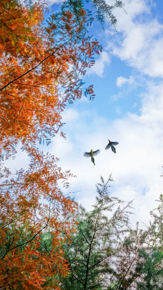 傍晚,家附近,小森林里,抬头看见了飞翔的喜鹊,很幸运,抓拍了下来。有一只喜鹊还含着果子。