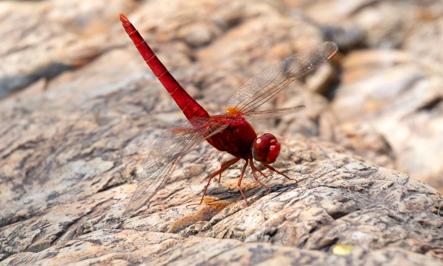 红蜻蜓,停留在小溪边的石头,蓄势待发,准备扑食蚊子等小型飞行昆虫。