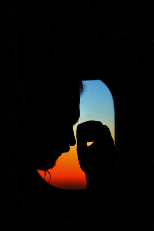 机舱对面男人侧身坐着,整张脸隐没在昏暗机舱投下的深重剪影里。男人的身体微微前倾,尽管看不清五官,但那低垂的嘴角宛如一道凝固的沟壑,机舱内只有低沉的引擎轰鸣充当背景,他的剪影像是凝固在这幅瞬息万变的天空中,那紧闭的唇角和深蹙的眉头,无声地诉说着某种难以言明的疲倦,或是一场远未结束的、无声的内在独白。
