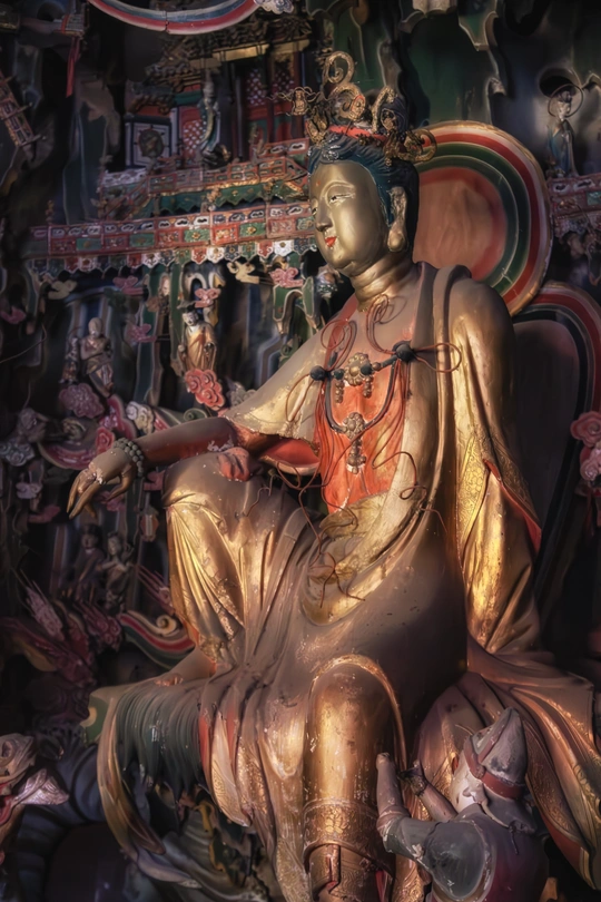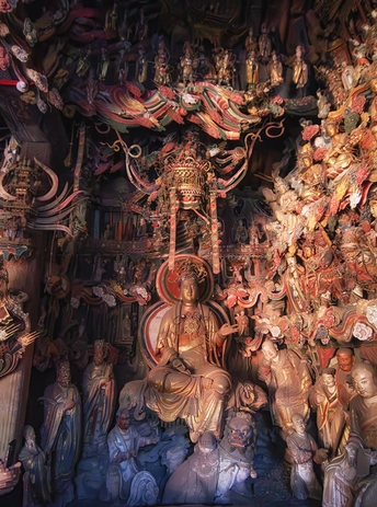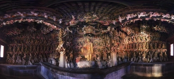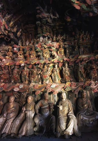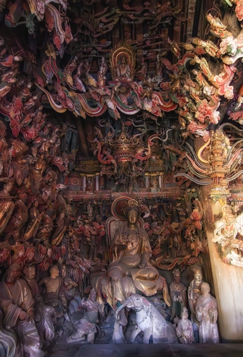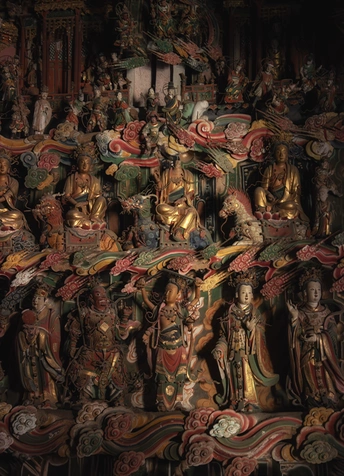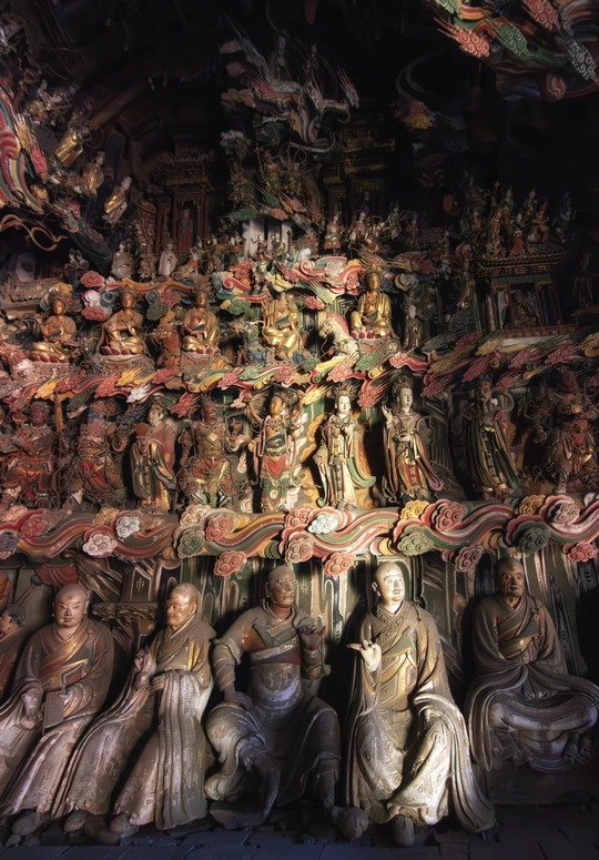 明清时期建筑,正殿为公元1581年初建时原构。殿内悬塑将儒释道三教文化精华浓缩于一堂,主像奉三大士,南北两壁塑有十八罗汉、二十四诸天、十二圆觉。壁上、梁间布满故事悬塑,殿内共约有大小塑像500余尊,堪称一座三教合一的彩塑艺术精品陈列馆。