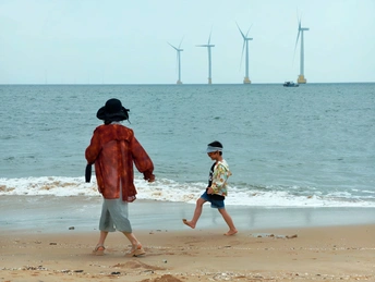 蔚蓝的大海,金黄的沙滩,拍起的白色波浪,远处耸立的风力电站,这夏日的海滩是孩子们的乐园。