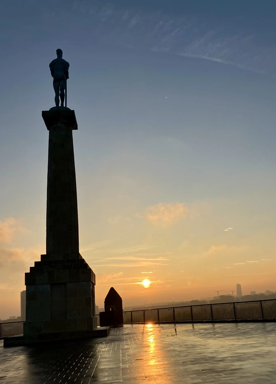 这张照片捕捉到了日出时分的城市地标,构图上将雕塑置于画面中心,突出了其庄严感。光影运用较为出色,日出柔和的光线勾勒出雕塑的轮廓,并在地面上形成倒影,增强了画面的层次感和空间感。色彩方面,天空的渐变色与地面的反光相互呼应,营造出一种宁静而美好的氛围。照片的主题意义在于展现了城市历史的象征,以及新的一天开始的希望。如果能在拍摄时注意雕塑的细节表现,或者尝试不同的拍摄角度,或许能进一步提升作品的艺术价值。总的来说,这是一张成功的风光摄影作品,具有一定的观赏性和艺术性。