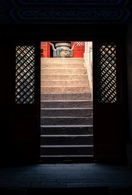 古门半掩,似一位沉默的老者,守着一段被岁月浸润的过往。门内,石阶层层,向着幽深处延展,像是大地的脊梁,承载着时光的重量。光影在砖石间游走,勾勒出岁月的褶皱,每一道纹路里,都藏着说不尽的故事。 那尊古鼎静静伫立在石阶尽头,青黑的釉色上,斑驳痕迹是时光啃噬的印记。它曾见过晨钟暮鼓里的袅袅香火,听过信徒们虔诚的祈愿,如今,却在这静谧的空间里,与沉默的砖石、木门相伴。鼎身的花纹,似还残留着当年工匠的温度,一笔一划,都是匠心的诉说,在明暗交错的光线里,缓缓流淌出往昔的烟火气。 阳光从门的缝隙间挤进来,给石阶镀上一层毛茸茸的金边。每一级台阶,都像是时光的刻度,踩踏过无数人的足迹。或许是身着长衫的书生,负笈而过,怀揣着报国之志与满腹经纶;或许是白发苍苍的老僧,步履蹒跚,把一生的修行都嵌进这石阶的凹凸里。那些脚印早已被岁月抚平,可痕迹却永远留在了时光的褶皱中,成为历史无声的注脚。 站在古门前,仿佛能听见时光轻吟。它诉说着朝代更迭的喧嚣与沉寂,讲述着凡人烟火的温暖与离散。古鼎的影子在墙上晃荡,与木门的格子交织,织出一幅模糊的旧梦。这梦,关于信仰,关于坚守,关于在岁月洪流中始终未被冲走的本真。