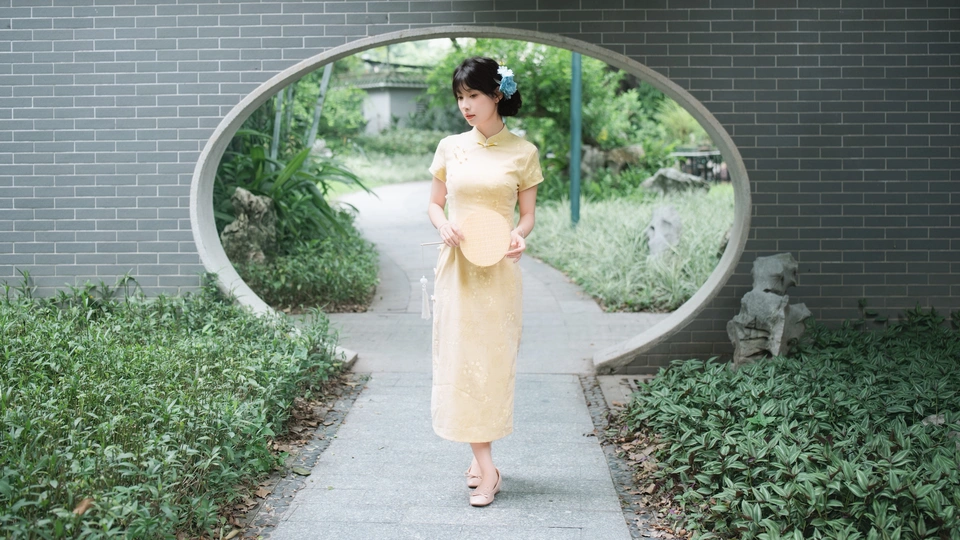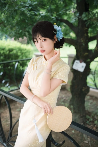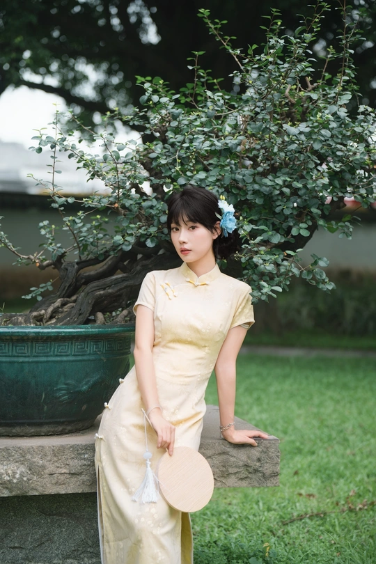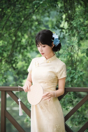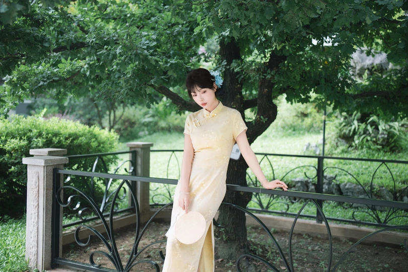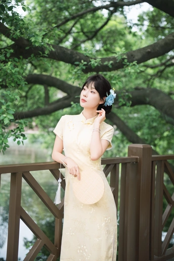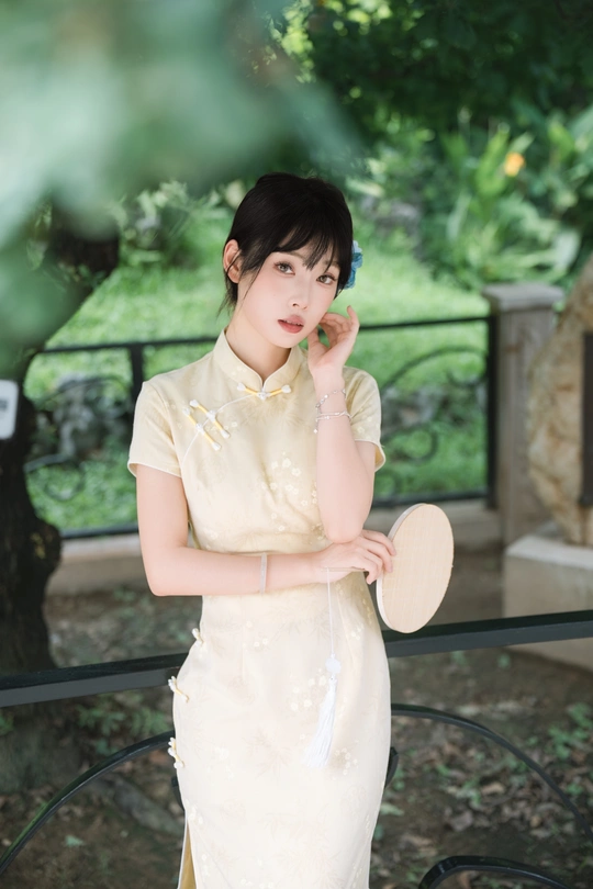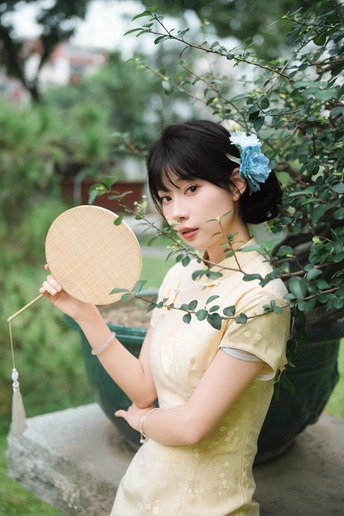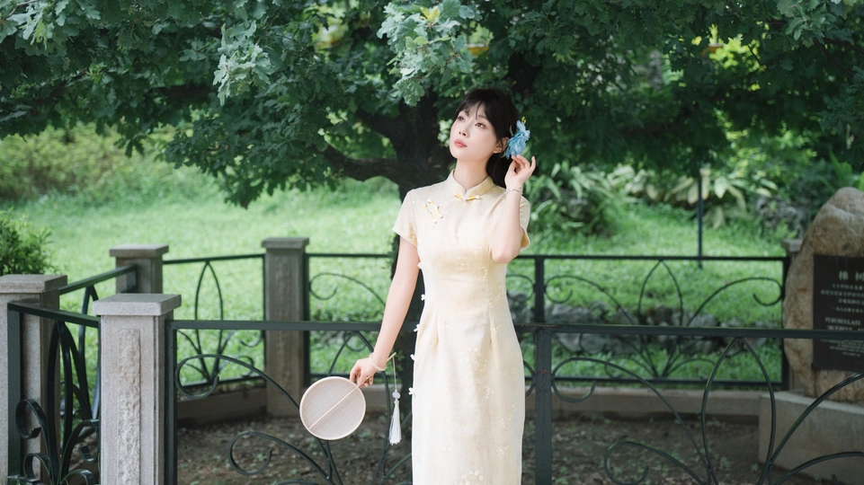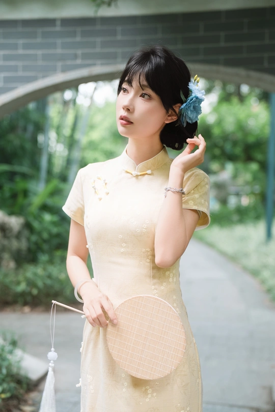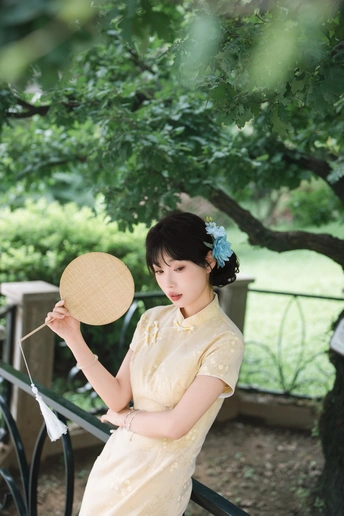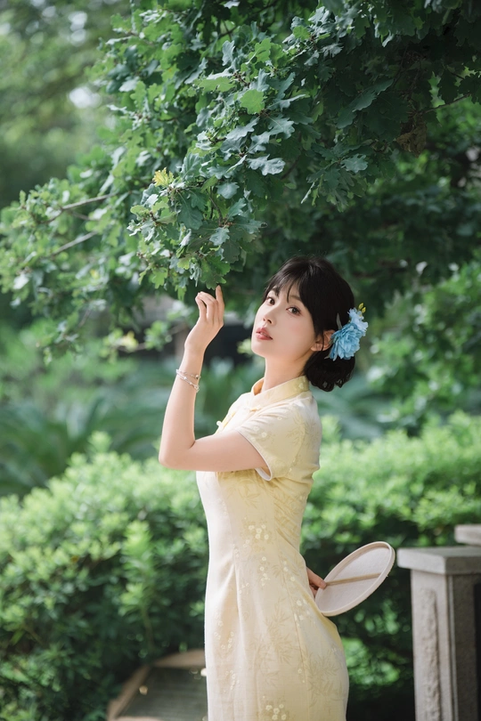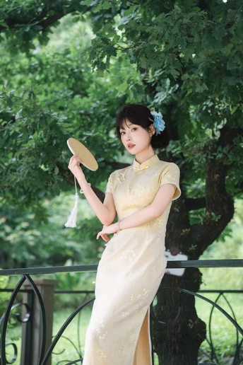 “ 一袭浅黄旗袍,簪花绾发,执把团扇,漫步园林。 青枝绿叶作陪,回廊假山为景,时光都慢了下来。 风掠过衣角,仿佛把民国的温婉,轻轻吹进了今夏💐
